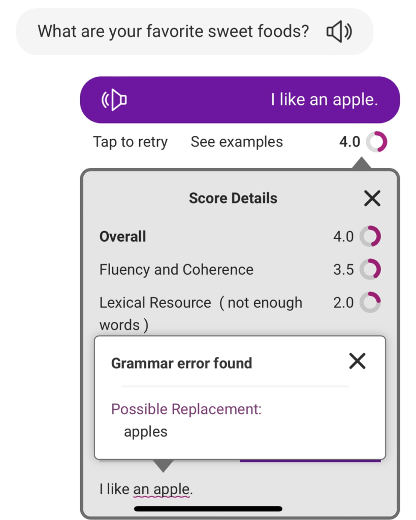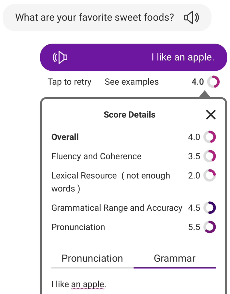 これにより、自分が発言した”内容”についても振り返ることができるようになりました。IELTSではより正確な文法の活用も評価基準の一つです。自分では気づかないようなエラーもあるかと思います。ぜひFLOWでより正確な英語表現ができるように練習してください。