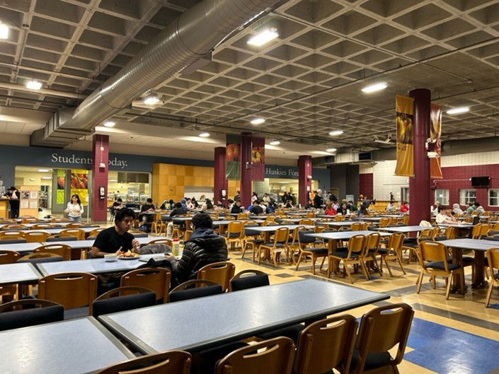 ほとんど毎食ダイニングホールで食べていました。キャンパスは端から端まで歩いて30分ぐらいなのですが、その中にダイニングホールは7個あって、それぞれメニューが日替わりで豊富で、ダイニングホールごとに違うので楽しかったです。また、大学のアプリでメニューを見れるので、メニューを見て決める時もありました。