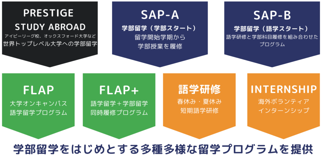JSAFは2000年の設立から、日本の大学生に特化した、独自の海外協定大学への長期留学を含め様々な留学プログラムを企画しています。また、海外大学や教育機関と提携し、豊富な留学先と多彩なプログラムを提供しています。最短3週間から参加できる短期留学、3~5カ月の中期留学、そして1学期間から1年間の長期留学があります。短期留学の場合は、語学学校で英語またはその他言語を学ぶプログラムからインターンシップやボランティアなどがあります。一方、長期留学の場合は短期留学同様語学をメインで学ぶプログラムだけでなく、現地大学生と同じように学部授業を履修する学部留学、または1学期目は語学研修で2学期目は学部履修など、幅広い選択肢の中から、最適なプログラムをご案内します。