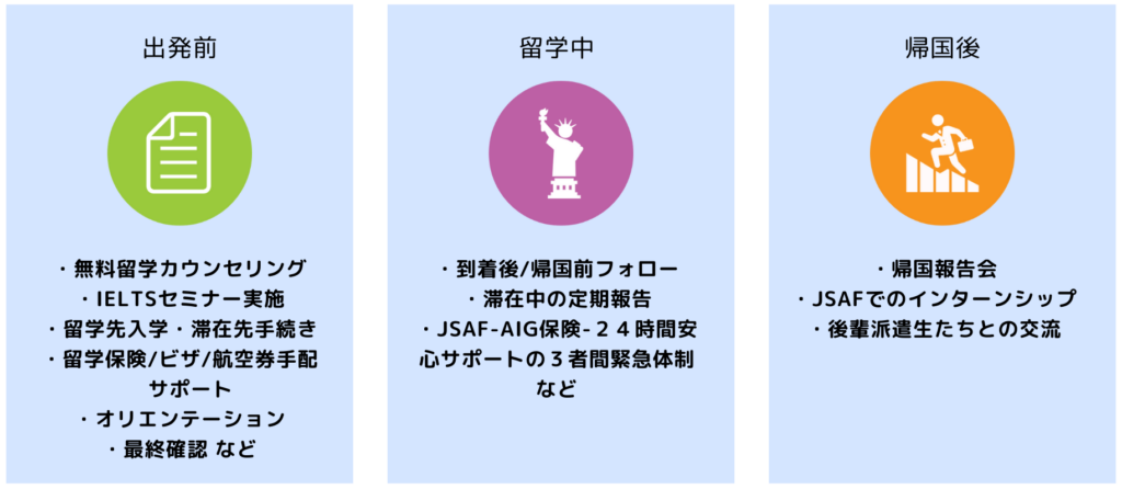 JSAFは、留学プログラム参加者に対して出願準備から帰国後まで安心して留学を実現できる環境を提供します。また、出発前から帰国後まで一貫した、ワンストップの連絡体制のもと、サポートにあたります。留学出発から帰国まで、参加者の学業および学生生活全般をモニターいたします。