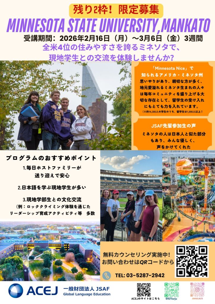 JSAFの姉妹団体ACEJではこのたび、アメリカ ミネソタ州立大学マンケート校(Minnesota State University, Mankato)で学ぶ春休み語学研修プログラムの