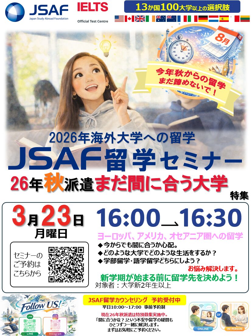 【今年秋から留学まだ諦めないで!】2026年秋派遣まだ間に合う大学特集セミナー