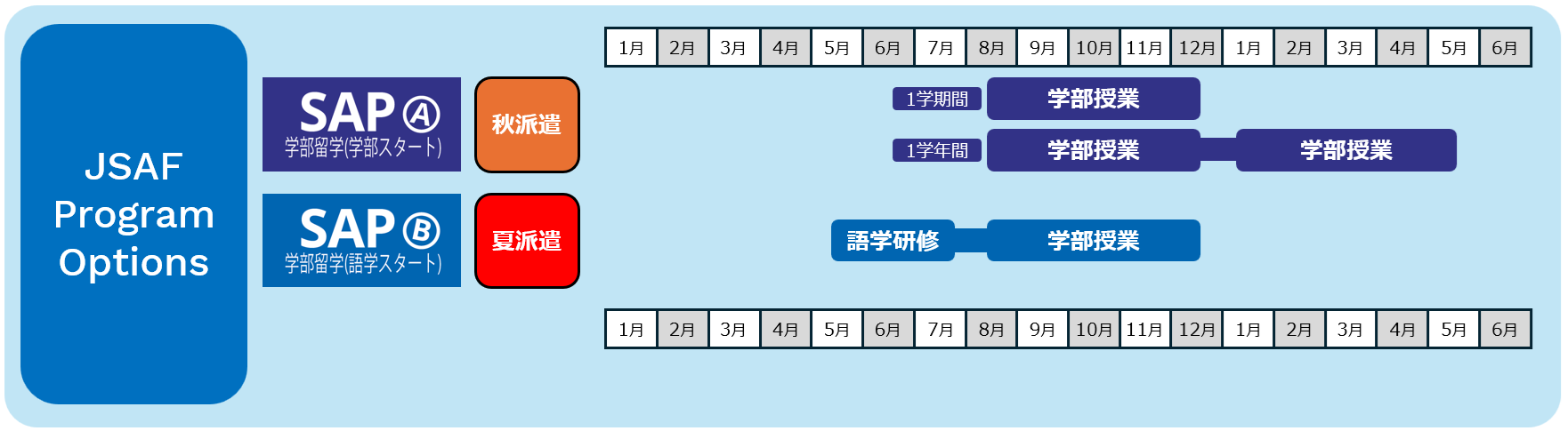 ※SAPは夏派遣(5月開始)のみ語学スタート可能、秋学期は英語指定科目(1単位)の受講必須