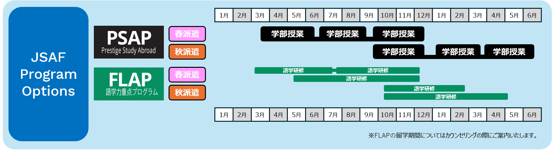 | 留学プログラム | PSAP、FLAP |