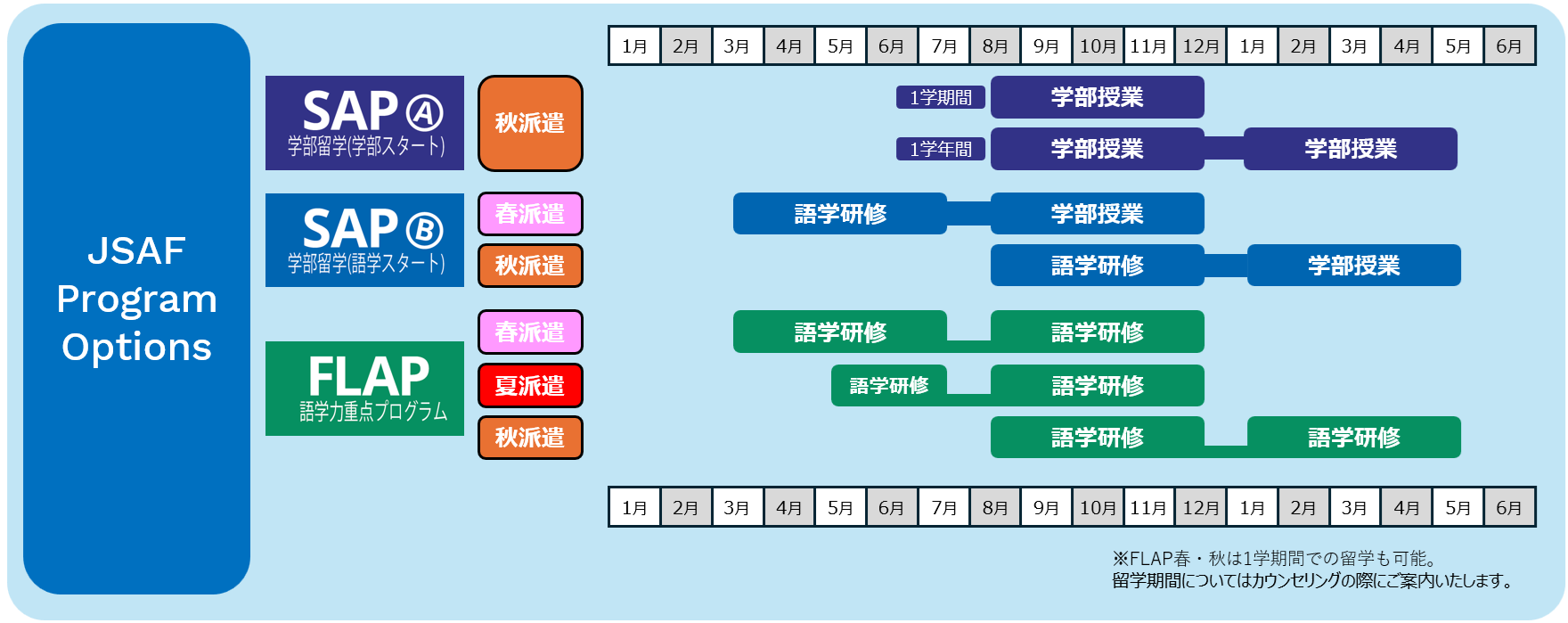 | 留学プログラム | SAP、FLAP |