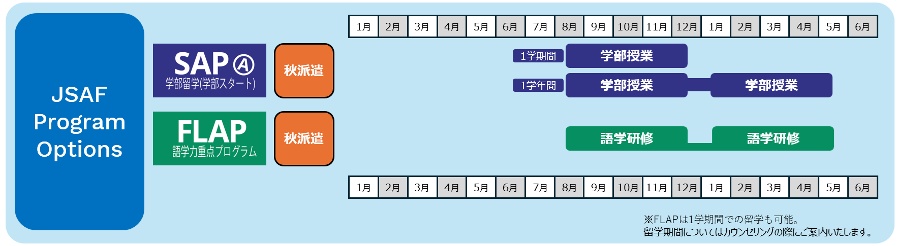 | 留学プログラム | SAP、FLAP |