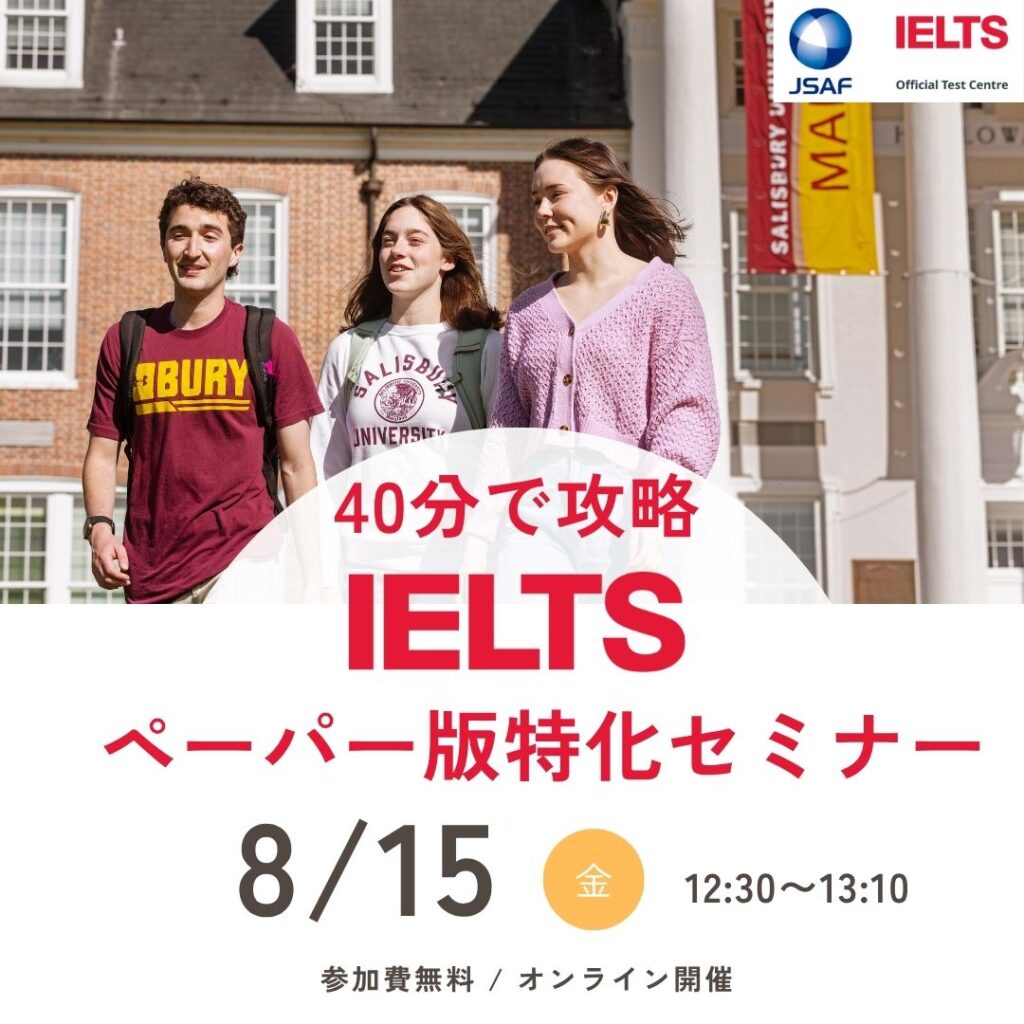 JSAF -IELTS公式テストセンターによるIELTSオンラインセミナーを開催します。「パソコンが苦手でコンピューター版は不安…」「まずは慣れた形式で受験したい!」そんな方にぴったりの IELTSペーパー版に特化した30分講座を開催します。ペーパー版ならではの特徴/試験当日の流れ/持ち物・注意点などを、初めての方でも安心できるよう分かりやすく解説します!