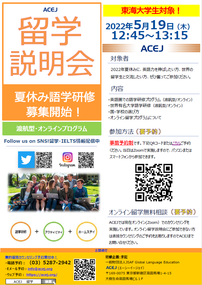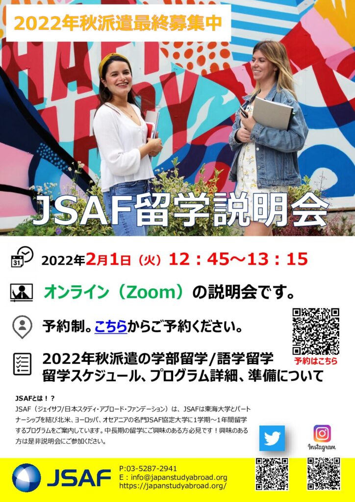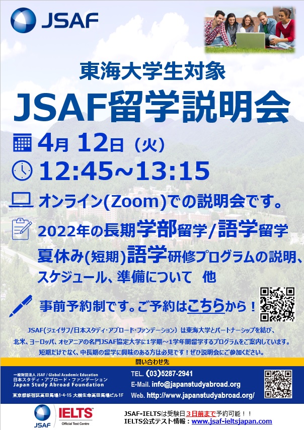 このページでは、東海大学生向けJSAF留学説明会に関する情報をお届けします。ぜひご確認のうえ、奮ってご参加ください。ご不明な点はお気軽にJSAFまでお問合せ下さい。