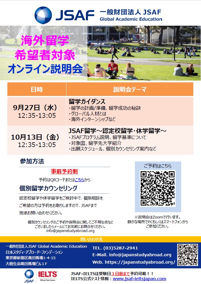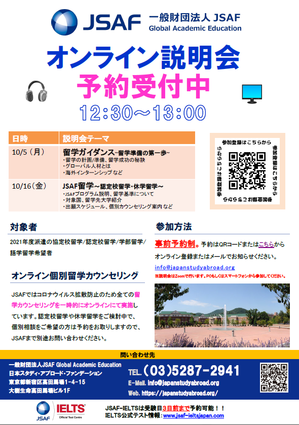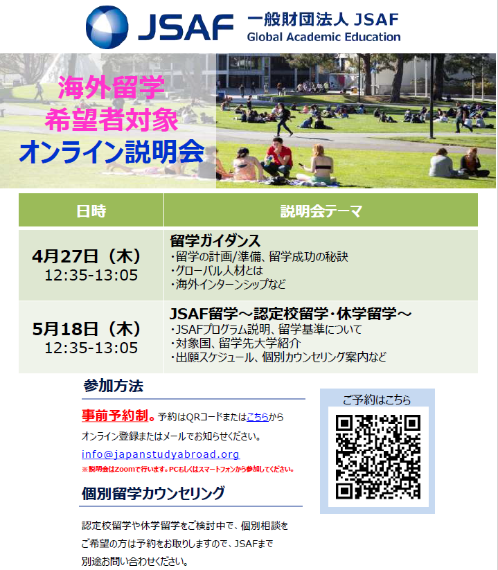 このページでは、東京女子大学生向けJSAF留学説明会に関する情報をお届けします。ぜひご確認のうえ、奮ってご参加ください。ご不明な点はお気軽にJSAFまでお問合せ下さい。