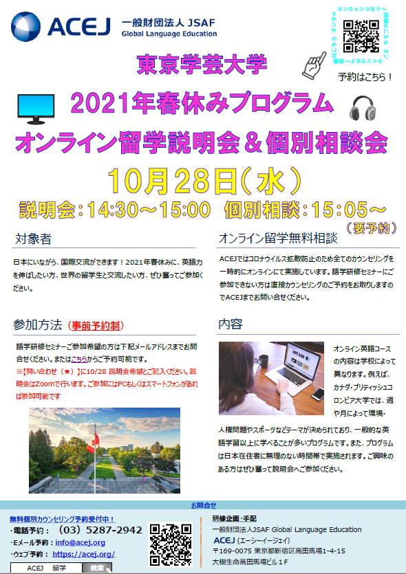 大学別JSAF留学・学内説明会情報EVENT ホーム - 大学別JSAF留学・学内説明会情報 - 東京学芸大学 東京学芸大学 このページでは、東京学芸大学生向けJSAF留学説明会に関する情報をお届けします。ぜひご確認のうえ、奮ってご参加ください。ご不明な点はお気軽にJSAFまでお問合せ下さい。 東京学芸大学 終了しました オンライン留学カウンセリングおよび留学セミナー実施中! 留学を検討している方は、まずは下記ステップから始めましょう! 東京学芸大学 留学情報ページはこちら