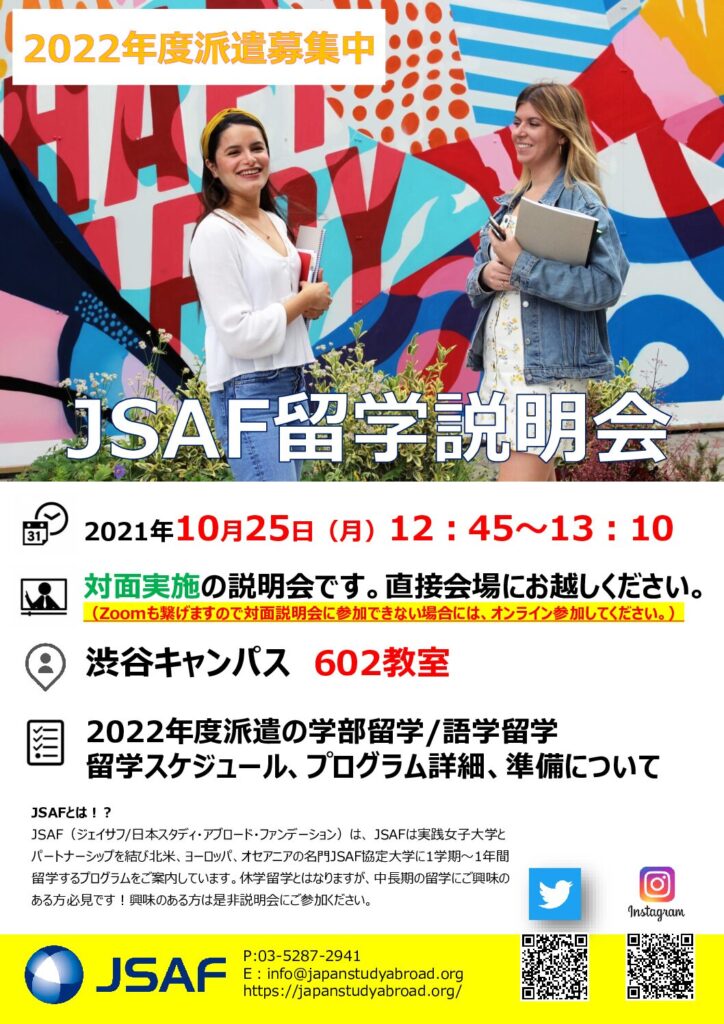 大学別JSAF留学・学内説明会情報EVENT ホーム - 大学別JSAF留学・学内説明会情報 - 実践女子大学 実践女子大学 このページでは、実践女子大学生向けJSAF留学説明会に関する情報をお届けします。ぜひご確認のうえ、奮ってご参加ください。ご不明な点はお気軽にJSAFまでお問合せ下さい。 実践女子大学 終了しました オンライン留学カウンセリングおよび留学セミナー実施中! 留学を検討している方は、まずは下記ステップから始めましょう! 実践女子大学 留学情報ページはこちら
