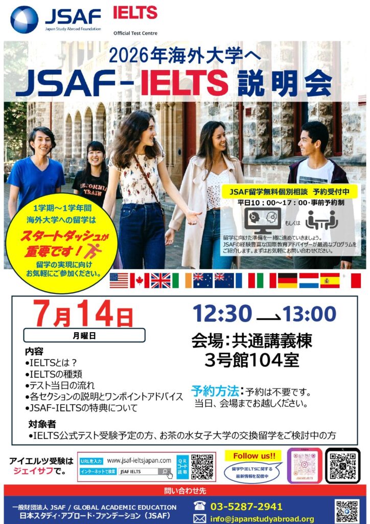 このページでは、お茶の水女子大学生向けJSAF留学説明会に関する情報をお届けします。お茶の水女子大学生の方はぜひご確認のうえ、奮ってご参加ください。ご不明な点はお気軽にJSAFまでお問合せ下さい。