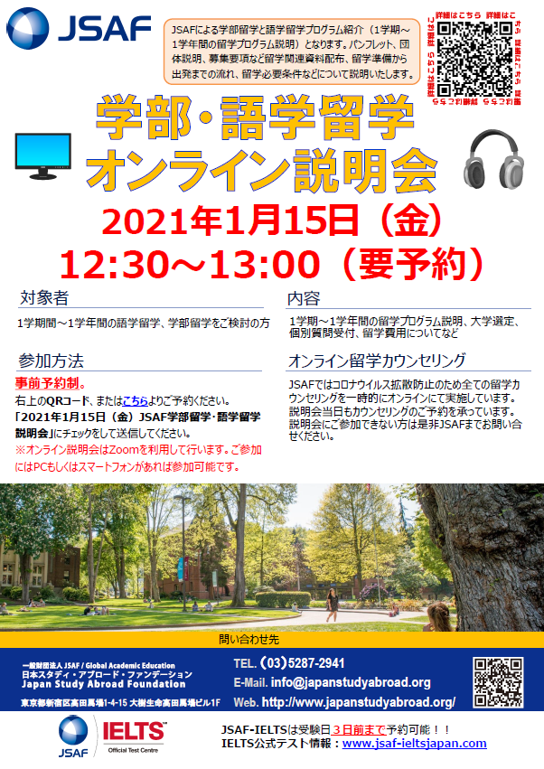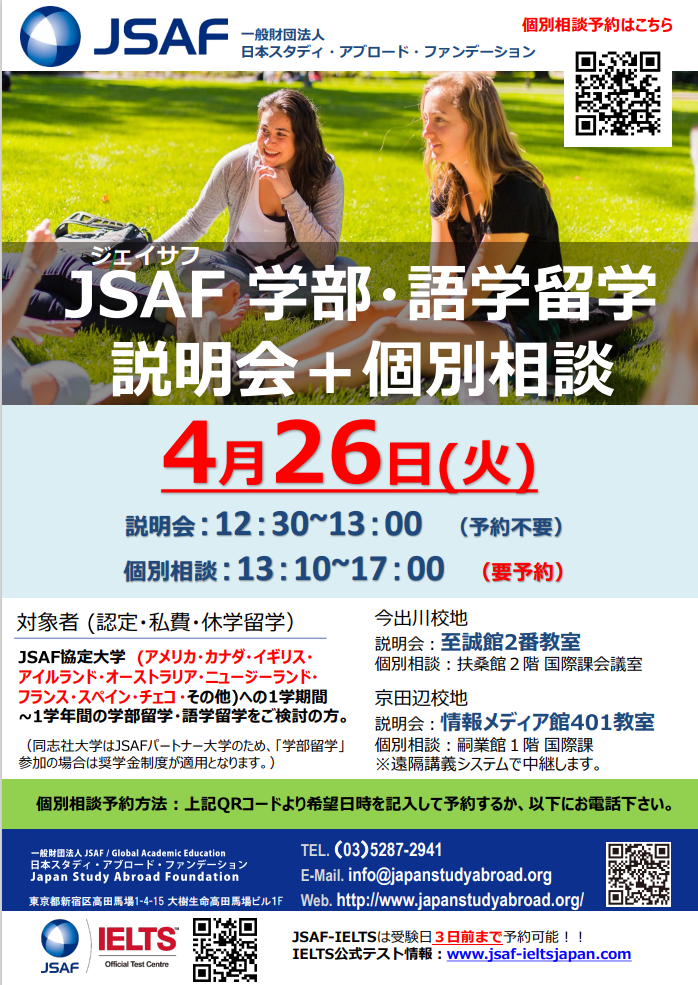 このページでは、同志社大学生向けJSAF留学説明会に関する情報をお届けします。ぜひご確認のうえ、奮ってご参加ください。ご不明な点はお気軽にJSAFまでお問合せ下さい。