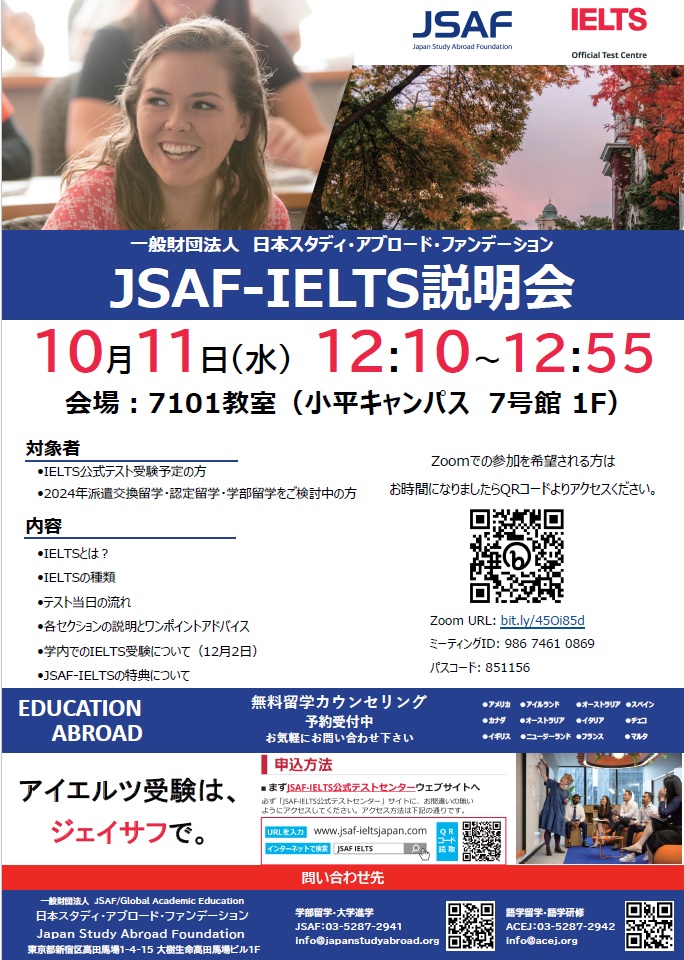 大学別JSAF留学・学内説明会情報EVENT ホーム - 大学別JSAF留学・学内説明会情報 - 津田塾大学 慶應義塾大学 このページでは、慶應義塾大学生向けJSAF留学説明会に関する情報をお届けします。ぜひご確認のうえ、奮ってご参加ください。ご不明な点はお気軽にJSAFまでお問合せ下さい。 津田塾大学 終了しました オンライン留学カウンセリングおよび留学セミナー実施中! 留学を検討している方は、まずは下記ステップから始めましょう!