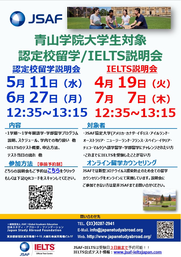 大学別JSAF留学・学内説明会情報EVENT ホーム - 大学別JSAF留学・学内説明会情報 - 青山学院大学 - 青山学院大学 IELTS Advantage 説明会 青山学院大学 このページでは、青山学院大学生向けJSAF留学説明会に関する情報をお届けします。ぜひご確認のうえ、奮ってご参加ください。ご不明な点はお気軽にJSAFまでお問合せ下さい。 青山学院大学 IELTS Advantage 説明会 終了しました