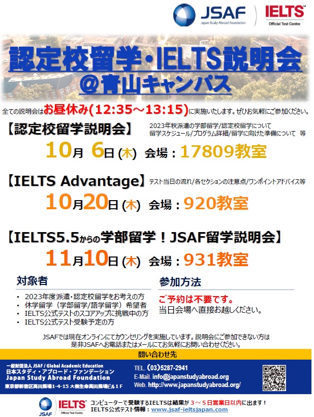 大学別JSAF留学・学内説明会情報EVENT ホーム - 大学別JSAF留学・学内説明会情報 - 青山学院大学 - 青山学院大学 認定留学説明会 青山学院大学 このページでは、青山学院大学生向けJSAF留学説明会に関する情報をお届けします。ぜひご確認のうえ、奮ってご参加ください。ご不明な点はお気軽にJSAFまでお問合せ下さい。 青山学院大学 認定留学説明会 終了しました