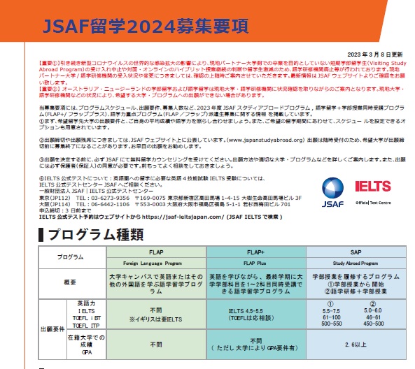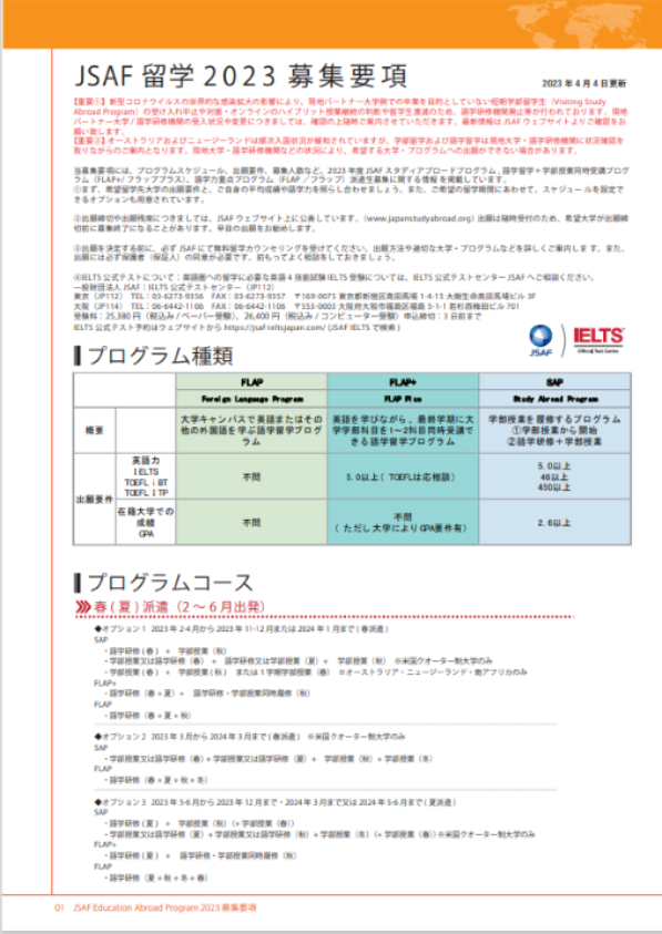 下記リンクよりJSAF協定大学一覧・プログラム別大学紹介・残席状況を確認いただけます。