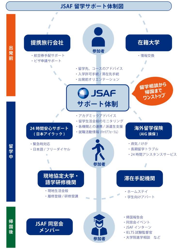 JSAFは、留学プログラム参加者に対して以下のような包括的サポートを行い、出願準備から帰国後まで安心して留学を実現できる環境を提供します。JSAFは、プログラム参加者に対して、出発前から帰国後まで一貫した、ワンストップの連絡体制のもと、サポートにあたります。留学出発から帰国まで、参加者の学業および学生生活全般をモニターいたします。
