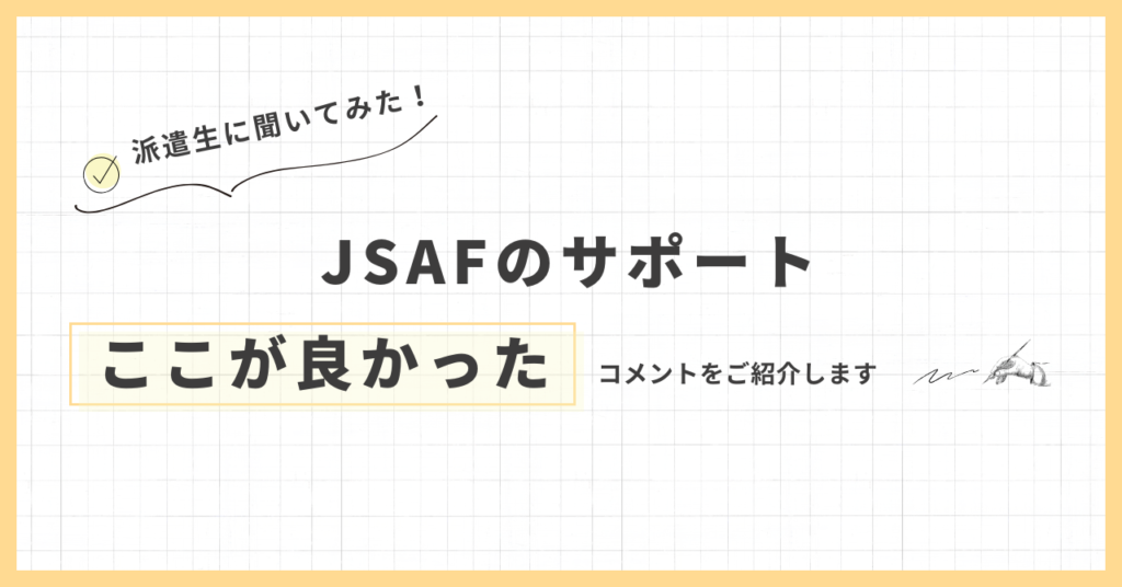 - JSAFのみなさん、今まで本当にありがとうございました。困ったことや緊急の問題が生じた際には、スタッフの皆様が迅速かつ的確に対応してくれて、いつでも心強いサポートを受けることができたおかげで、私は安心感を持って留学生活を過ごすことができました。私の留学経験は、皆様のおかげでより充実したものとなりました。(2022年秋派遣・横浜市立大学・ブリティッシュコロンビア大学)