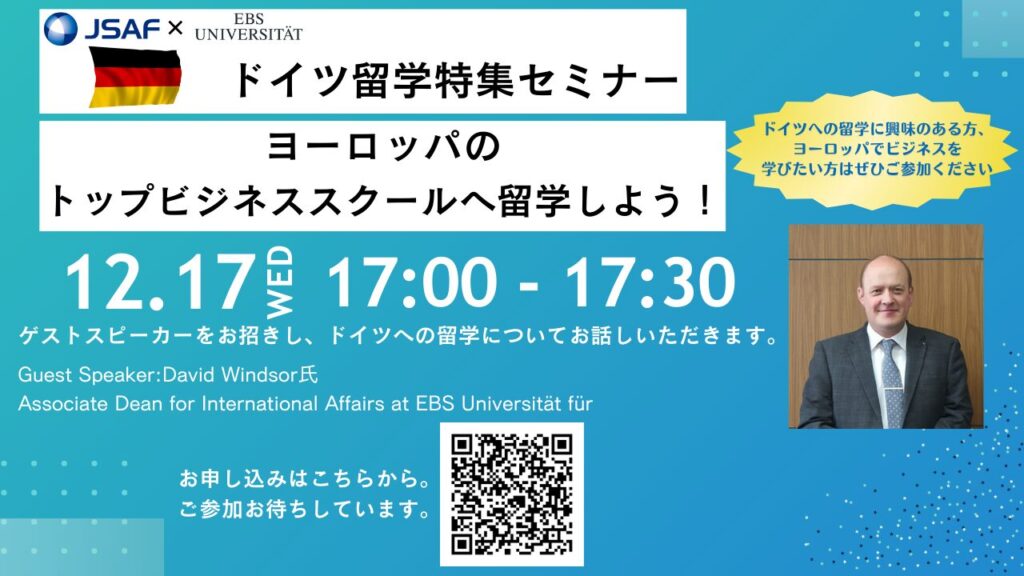 内容:ゲストをお招きし、ドイツ留学の魅力、EBS経済・法科大学での留学プログラムや大学生活についてお話ししていただきます。