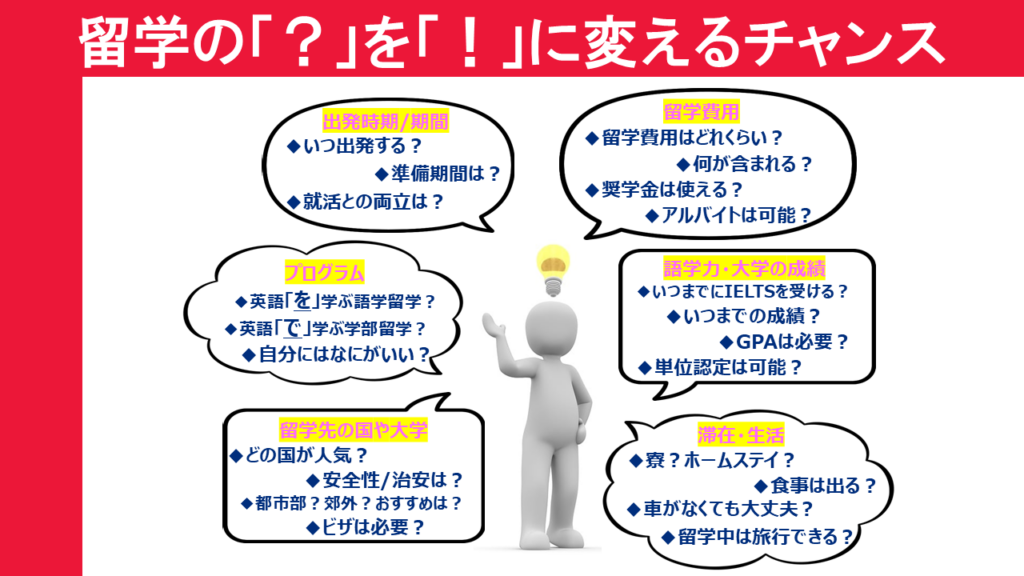 早めにカウンセリングのご予約をお願いします。留学に向けた準備を始めましょう。